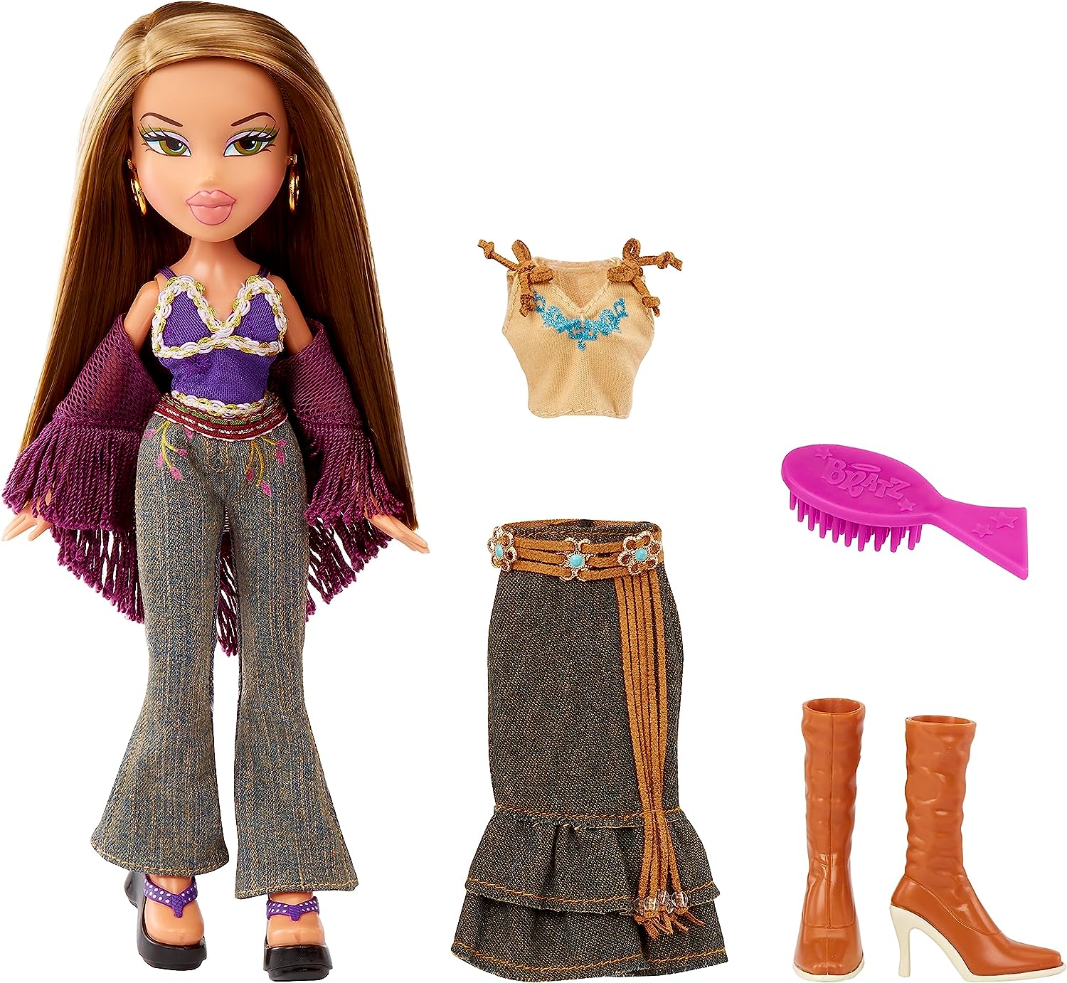 INCLUDES: 1 Bratz Original fashion doll, fashions, 2 pairs of shoes, earrings, hairbrush, and poster