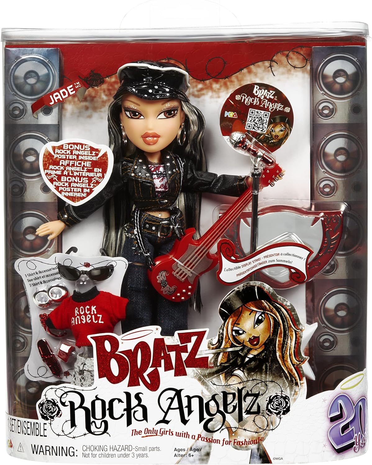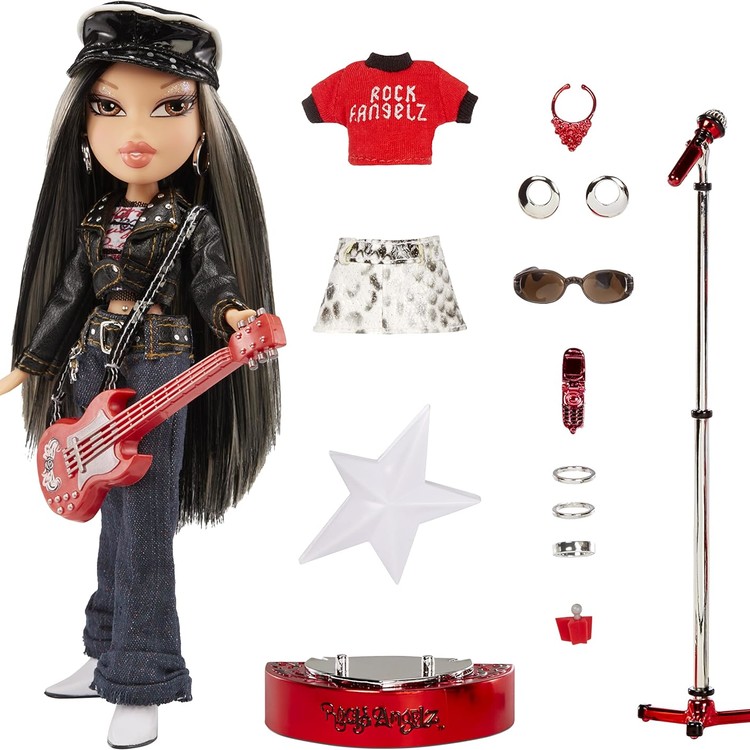 INCLUDES: 1 Bratz Rock Angelz 20 Yearz Special Edition Fashion Doll, 2 outfits, faux leather jacket, hat, guitar, shoes, jewelry, cell phone, sunglasses, nail polish, hair brush, and poster