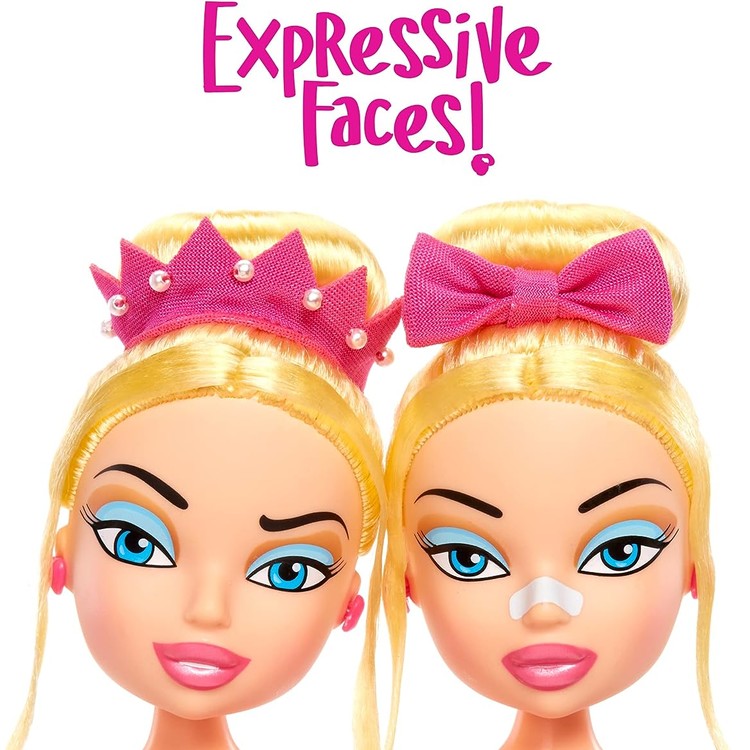 표현력 있는 얼굴: Kirstee는 "완전히 판단하는" 표정을 짓고 있고 Kaycee는 멍하니 쳐다보고 있습니다. 그들의 얼굴 데코와 머리 조각은 Bratz TV 시리즈의 스타일을 연상시켜 그들의 거친 개성을 포착합니다.
