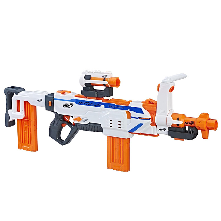 NERF MODULUS REGULATOR BLASTER WITH SWITCHFIRE TECHNOLOGY FOR 3 FIRING MODES: Single-fire 1 dart per trigger pull, burst-fire several darts per trigger pull, or continuous-fire all the darts