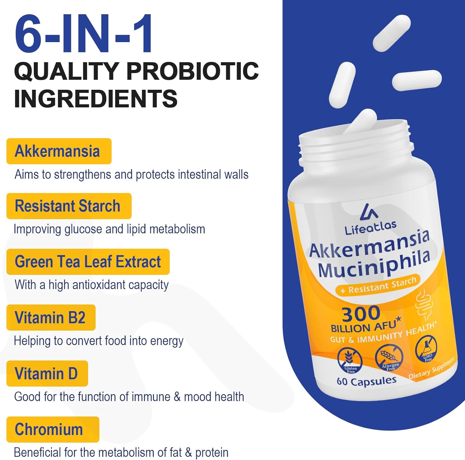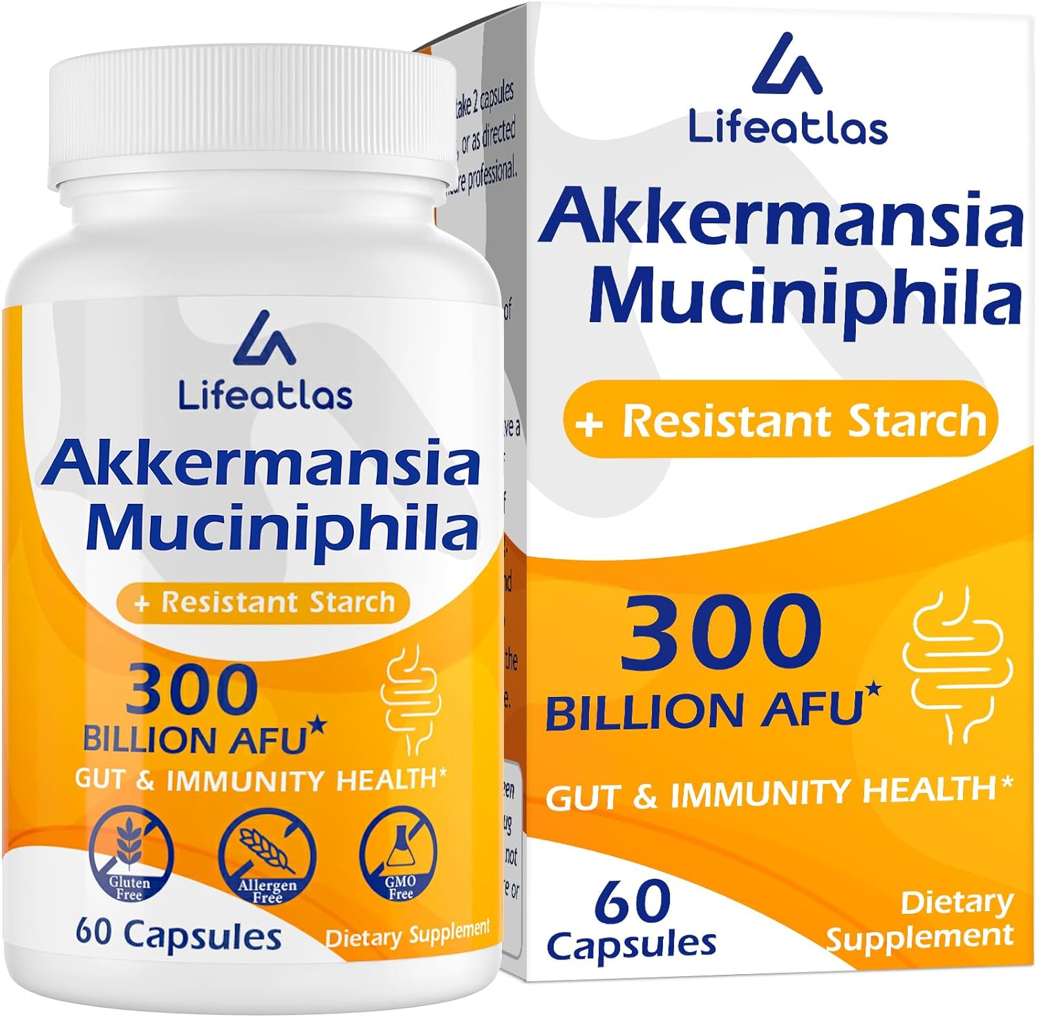 Lifeatlas 300 Billion AFU Akkermansia Muciniphila - Live Akkermansia Probiotics for Women & Men, for GLP-1, Digestive, Gut, Immune & Overall Health, Enhances Gut Digestive Lining Function, 60 Capsules