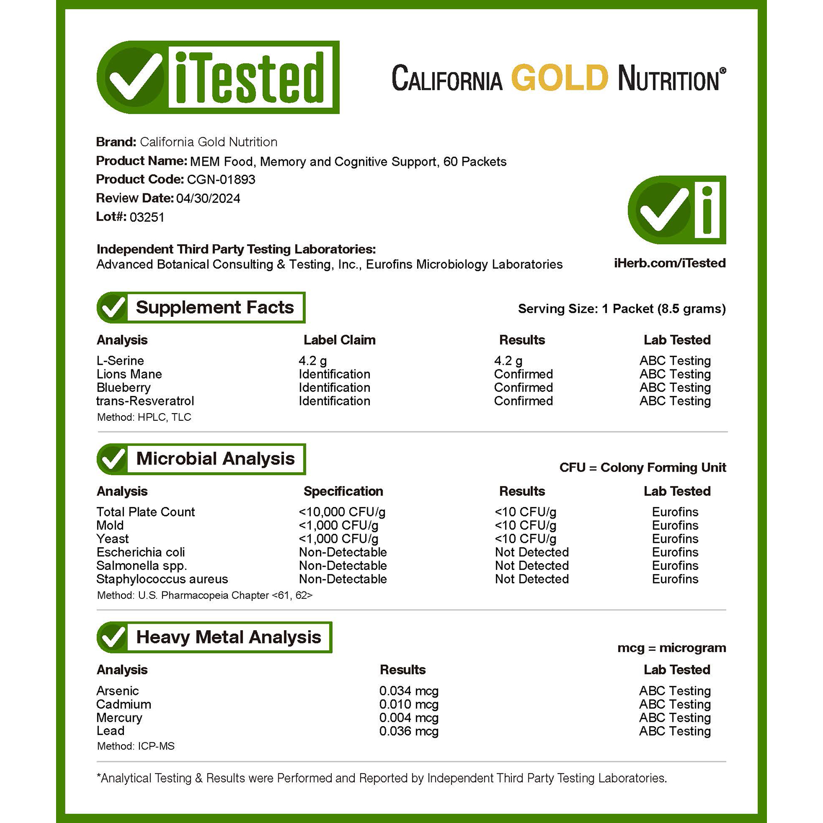 L-세린, 유기농노루궁뎅이버섯(Hericium erinaceus)(유기농귀리에서 배양된 균사체바이오매스 및 자실체), 블루베리즙분말(Vaccinium corymbosum)(열매), 아세틸-L-카르니틴(아세틸-L-카르니틴HCl에서 추출), 유기농강황추출물(Curcuma longa)(뿌리줄기),트랜스-레스베라트롤( 호장근(Polygonum cuspidatum) 추출물에서 추출)(뿌리), 프랑스해송껍질추출물(Pinus pinaster), 피롤로퀴놀린퀴논다이소듐소금(PQQ)
