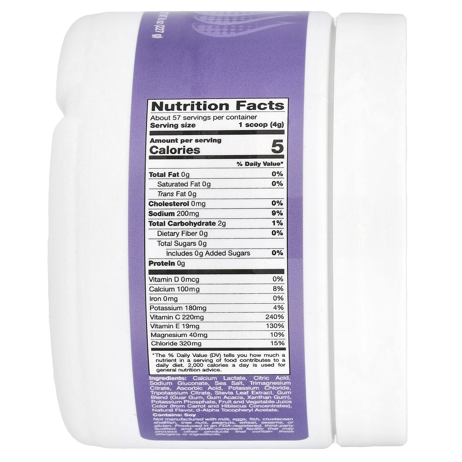 젖산칼슘, 구연산, 소듐글루코네이트, 천일염, 구연산삼마그네슘, 아스코르브산, 염화칼륨, 트라이포타슘시트레이트, 스테비아잎추출물, 검혼합물(구아검, 아라비아검, 잔탄검), 인산칼륨, 과일/채소즙색소(당근 및 히비스커스농축물에서 추출), 천연향료, d-알파토코페릴아세테이트