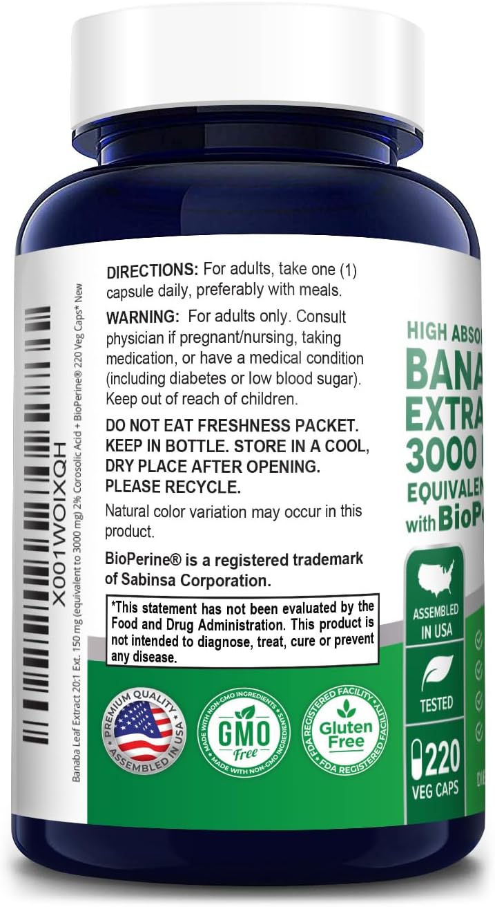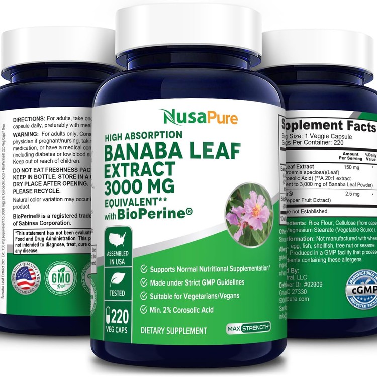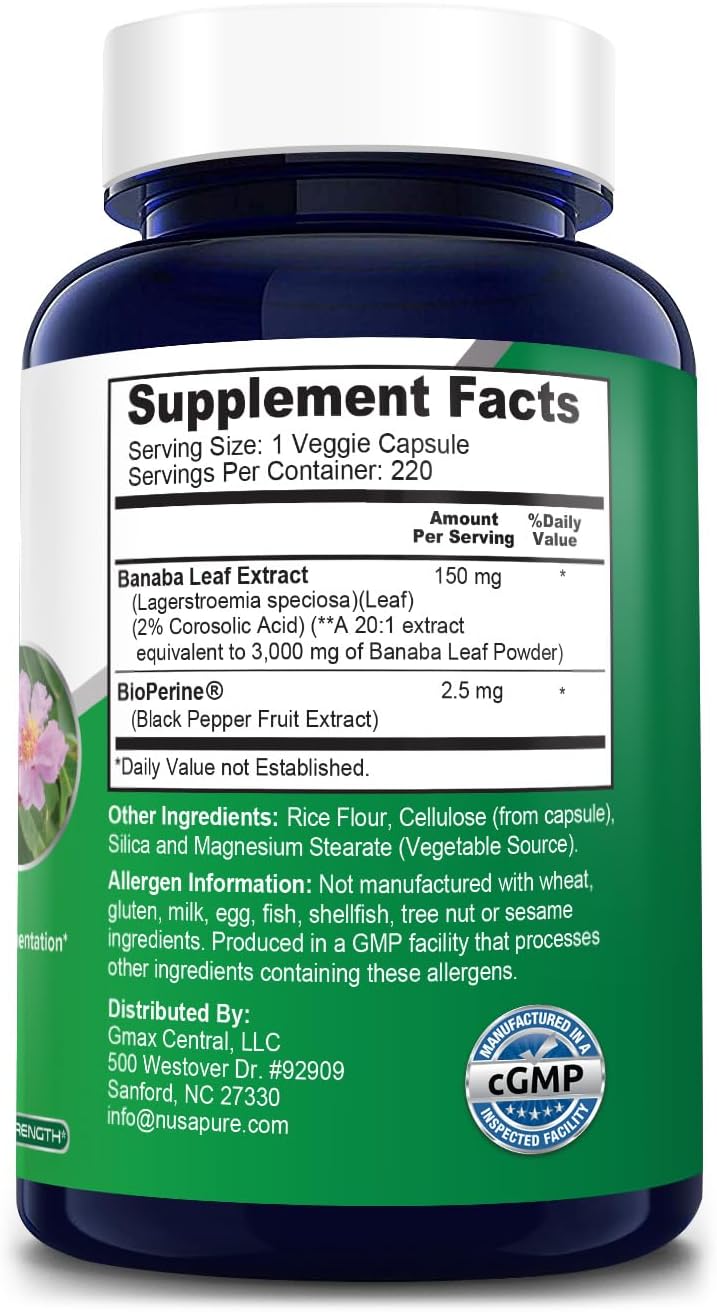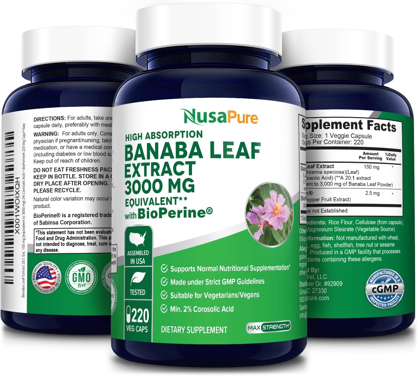 NusaPure Banaba Leaf Extract 3,000mg 220 Vegetarian Caps (Non-GMO & Gluten Free) 2% Corosolic Acid with Bioperine