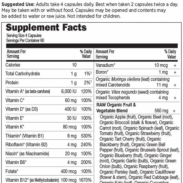 | RAW Organic Fruit & Vegetable Blend Organic Apple (fruit), Organic Beet (root), Organic Broccoli (stalk & flower), Organic Carrot (root), Organic Spinach (leaf), Organic Tomato (fruit), Organic Strawberry (fruit), Organic Tart Cherry (fruit), Organic Blackberry (fruit), Organic Green Bell Pepper (fruit), Organic Brussels Sprout (leaf), Organic Ginger (root), Organic Blueberry (fruit), Organic Garlic (bulb), Organic Green Onion (bulb), Organic Raspberry (fruit), Organic Parsley (leaf), Organic Cauliflower (flower & stem), Organic Red Cabbage (leaf), Organic Kale (leaf), Organic Cucumber (gourd), Organic Celery (stalk), Organic Asparagus (flower & stem) | 560 mg | + |