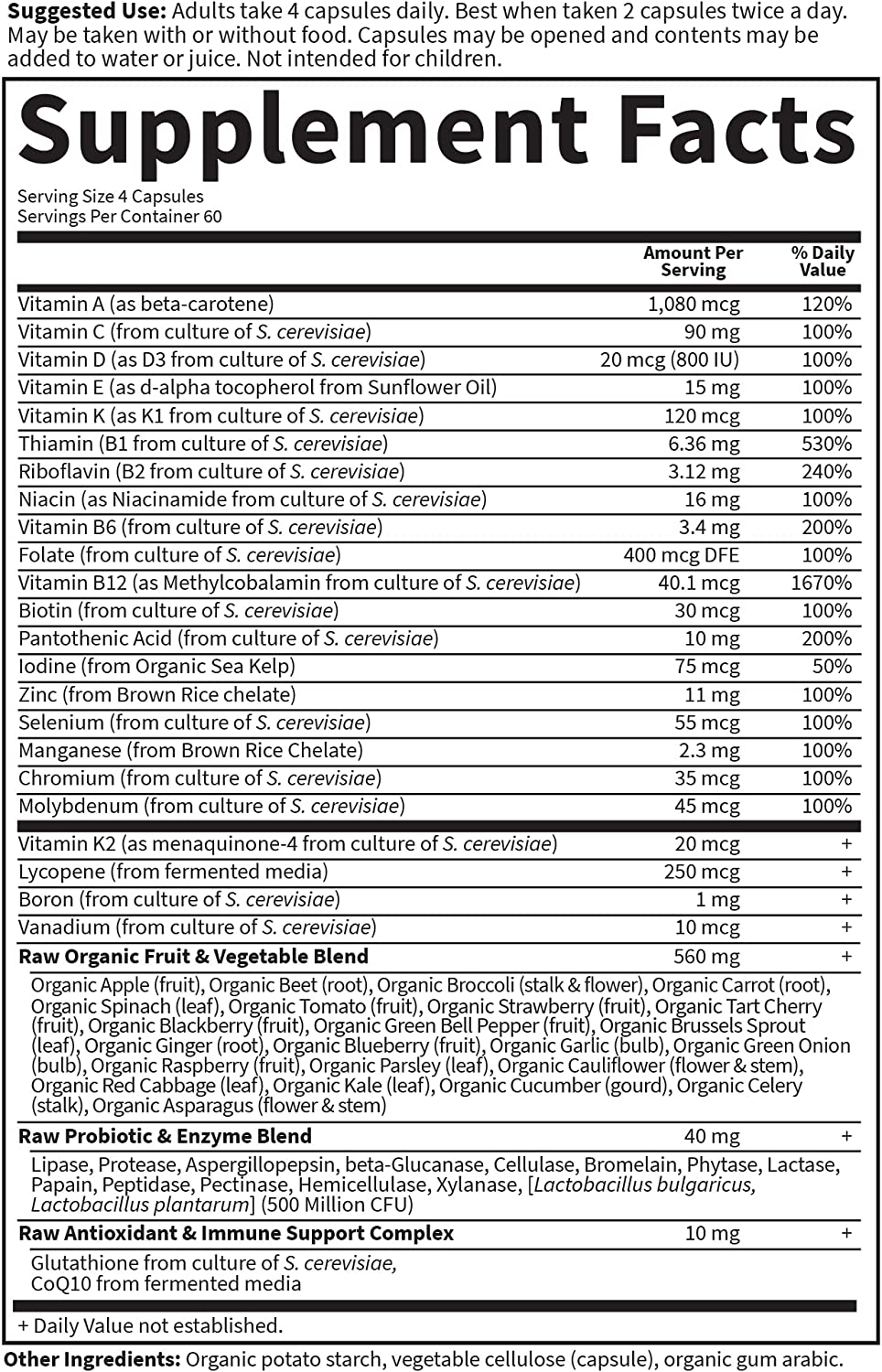 RAW MULTIVITAMIN: Vegetarian, gluten free, and dairy free whole food multivitamin, with no binders or fillers. Suggested Age: 18 Years and up